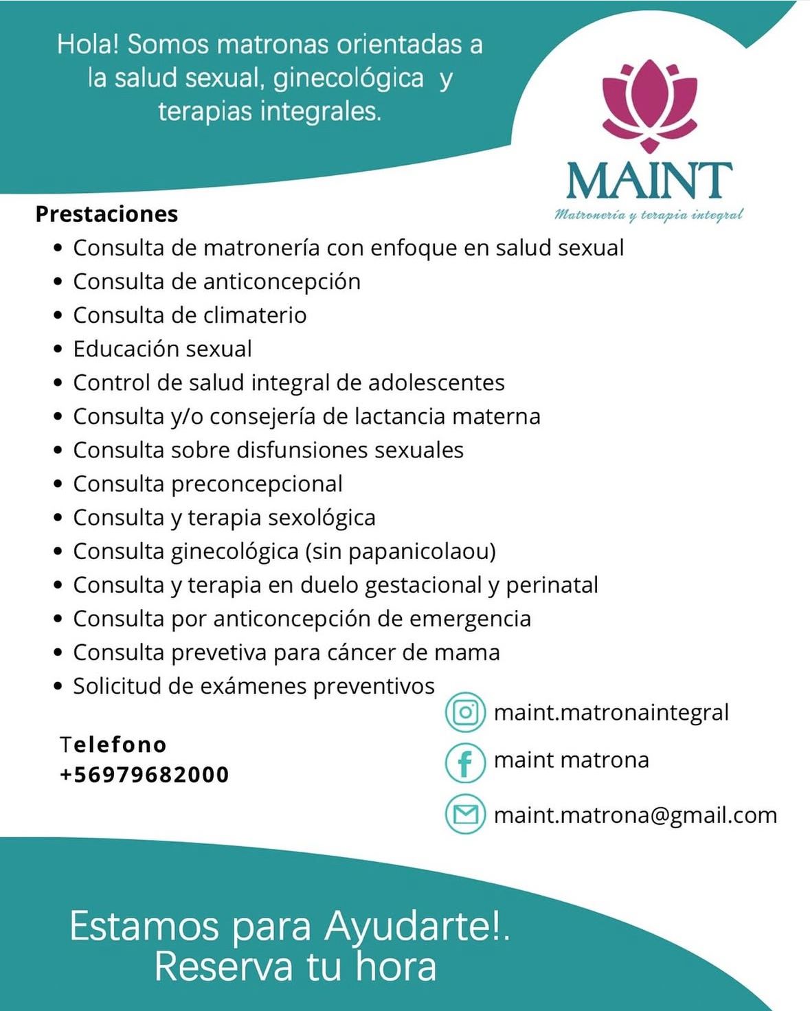 A lo largo de mi trayectoria he ejercido como Matrona Clínica, gestora de programas en salud sexual y reproductiva y docente universitaria, integrando la atención directa, la gestión territorial y la formación de futuras/os profesionales. Desde MAINT desarrollo terapias integrales orientadas al bienestar a lo largo del ciclo vital, y soy creadora del “Oráculo Cíclico Terapéutico”, un libro y mazo de cartas únicos diseñados para acompañar el autoconocimiento y la conexión consciente con el ciclo menstrual y hormonal. Mi enfoque combina la evidencia científica, la educación y el acompañamiento integral centrado en cada persona.